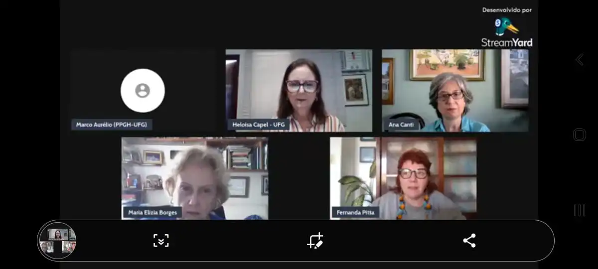 Mariana de Sousa Bernardes – TECCER/UEG, Luciana Hidemi Nomura – Arte e Cultura Visual/UFG, Roberta do Carmo Ribeiro – PPGH/UFRGS, Sarah Cabral – FAU/UEG, Maria Clara Capei de Ataídes – PPGDNUFG e Diogo Maroja Ribeiro – FD/UFGMAÇÃO